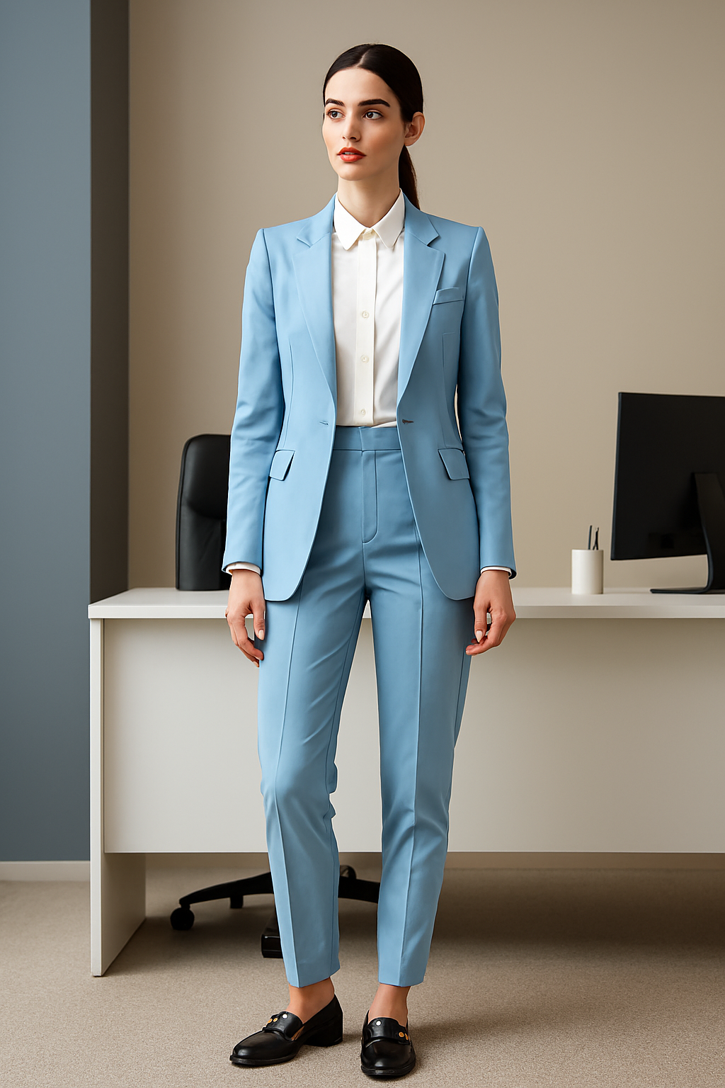 A tailored light blue blazer designed for confident, contemporary styling across catalog, editorial, and e-commerce formats. Cut with structured shoulders and a clean single-breasted front, it pairs seamlessly with matching trousers and a crisp white shirt for tonal clarity.