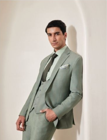 Vc_D 946/2 - This soft mint green suit features a tailored blazer and trousers paired with a matching mint shirt and deep green tie.