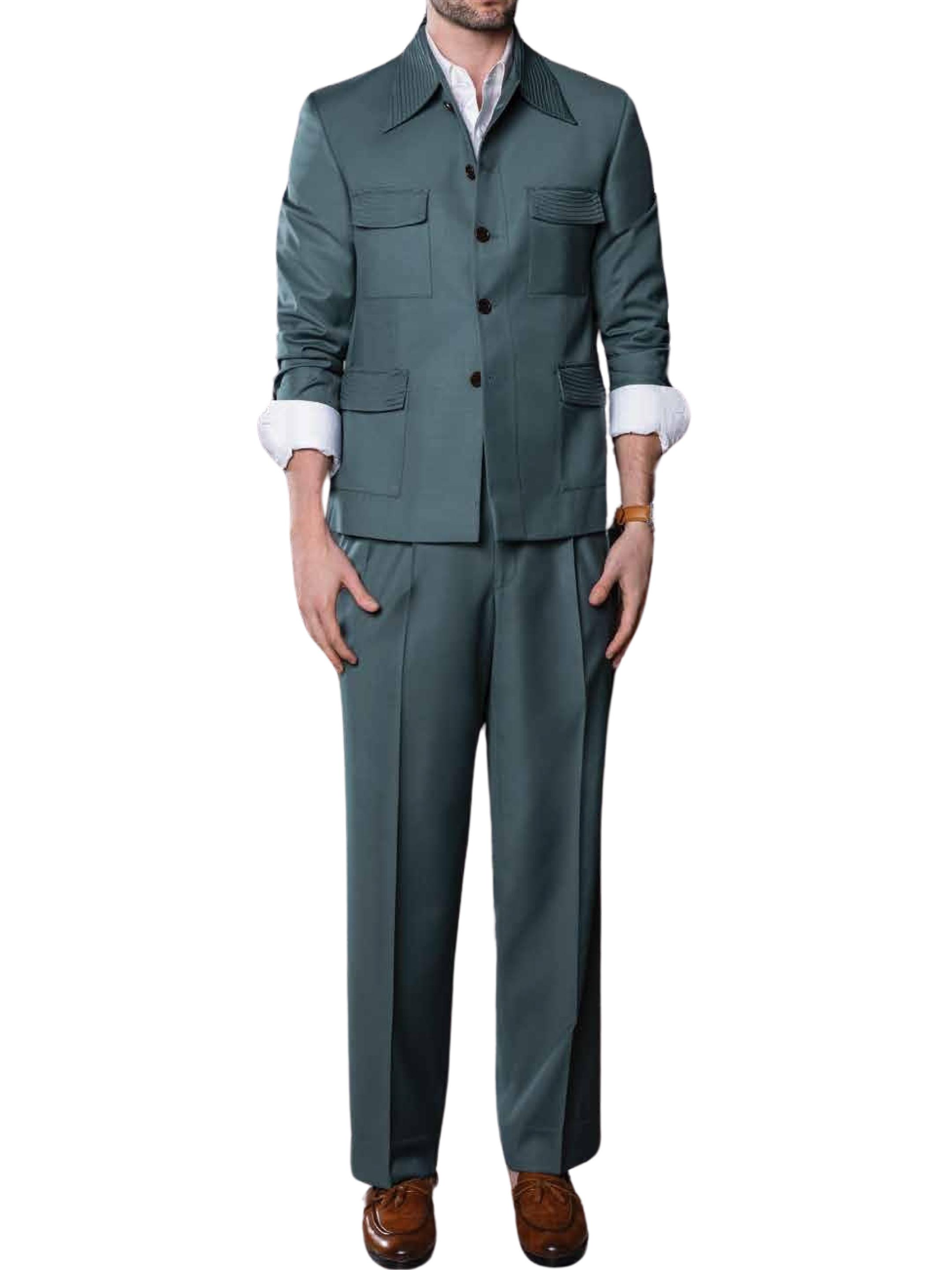 Azzimato Vercelli has a 5-button large collared safari jacket with 4 squared patch pockets with designer detailed flaps, the jacket is coordinated with similar fabric double-pleated trousers in a comfortable fit.