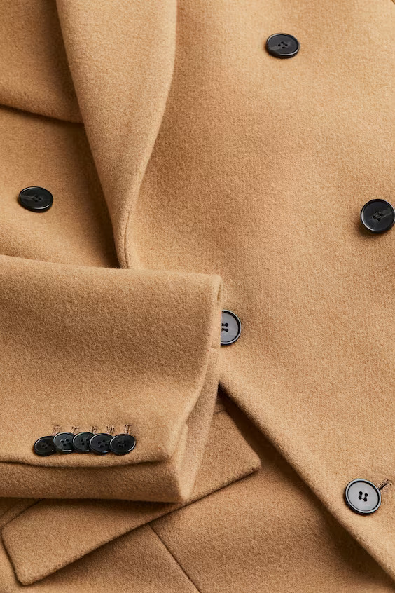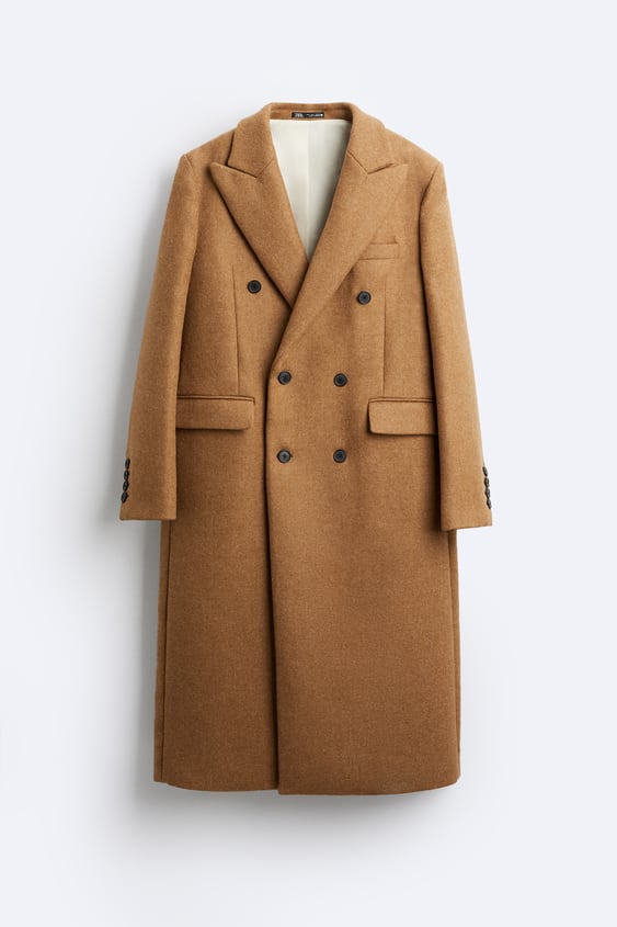 Long, double-breasted coat in a woven fabric made from a wool blend. Loose fit with peak lapels, buttons at the front, shoulder pads and long sleeves with buttoned cuffs. Welt chest pocket, jetted front pockets with a flap and a high-cut single back vent.
